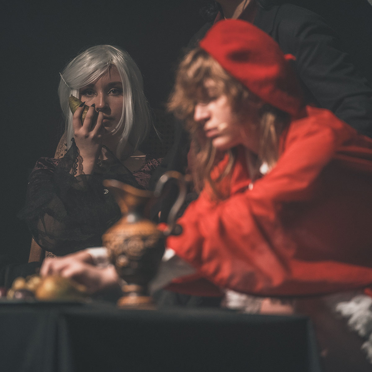 Jak fotografować w teatrze w sposób ciekawy? Przede wszystkim należy to robić w sposób możliwie zróżnicowany. Wielu fotografów (w tym ja!) na początku swojej przygody z fotografią teatralną popełnia jeden błąd. Są bardzo skupieni na omawianych już emocjach. Fotografują głównie portretowo. Warto jednak czasem pokusić się o nieco szerszy kadr. Wówczas pokazujesz interakcje między postaciami lub ciekawe oświetlenie sceniczne. Emocje są kluczowe, lecz równie istotny jest kontekst. Ten z kolei często pokazać można jedynie przy pomocy szerszego kadru.